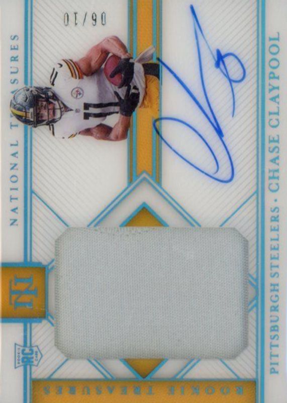 This card is 1 of 39 Chase Claypool's card variations in the 2020 National Treasures set being tracked by Sports Card Investor, including Rookie Patch Auto /99, Rookie Patch Auto - Green Jersey Number (/11), Rookie Patch Auto - Holo Silver /25, Rookie Patch Auto - Midnight /20, and Rookie Patch Auto - Stars & Stripes /20.