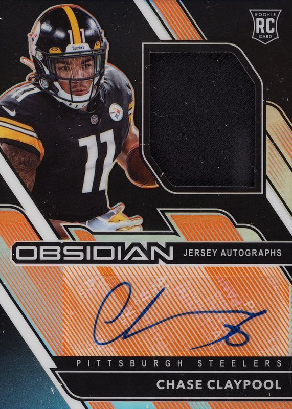 This card is 1 of 14 Chase Claypool's card variations in the 2020 Obsidian set being tracked by Sports Card Investor, including Rookie Jersey Autographs (/150), Rookie Jersey Autographs - Electric Etch Purple (/40), Rookie Jersey Ink (/150), Rookie Jersey Ink - Electric Etch Orange (/99), and Rookie Jersey Ink - Electric Etch Purple (/40).