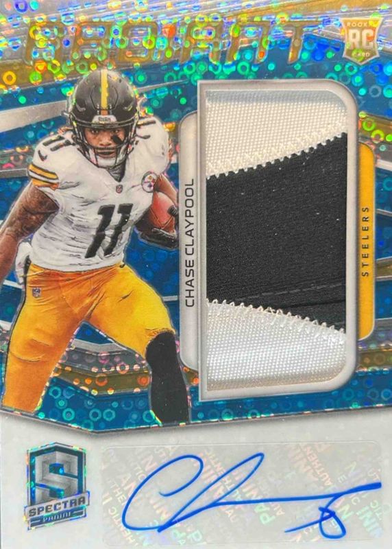 The Chase Claypool 2020 Spectra #11 Radiant Rookie Patch Signatures - Neon Blue (/60) card in Raw condition has not changed in price in the last 30 days and was last sold for $7.50 .