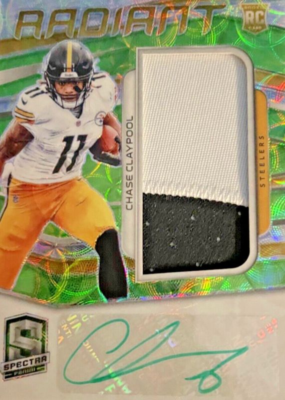 The Chase Claypool 2020 Spectra #11 Radiant Rookie Patch Signatures - Neon Green (/50) card in Raw condition has not changed in price in the last 30 days and was last sold for $9.99 .