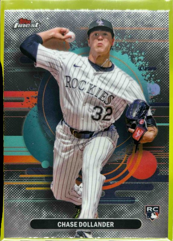 The Chase Dollander 2025 Topps Finest #160 Base Uncommon Rookie card is 1 of 65 Chase Dollander's card variations in the 2025 Topps Finest set being tracked by Sports Card Investor, including Base Common, Base Common - Oil Spill Refractor, Base Common - Refractor, Base Common - X-Fractor, and Base Rare.