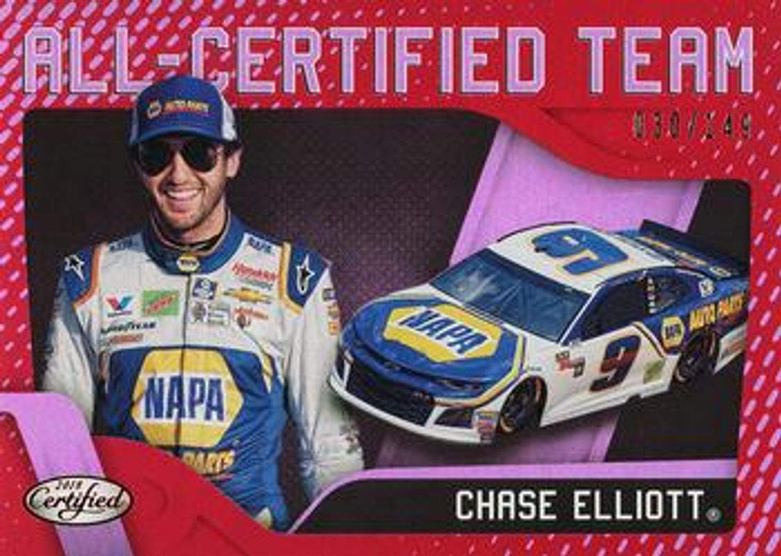 The Chase Elliott 2018 Certified NASCAR #ACT7 All Certified Team - Red /149 card is 1 of 114 Chase Elliott's card variations in the 2018 Certified NASCAR set being tracked by Sports Card Investor, including #29 Base /149, #91 Base /149, #91 Orange /249, #29 Orange /249, and #29 Mirror Gold /25.