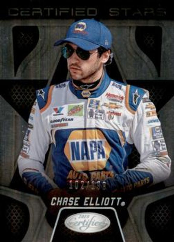 The Chase Elliott 2018 Certified NASCAR #CS1 Certified Stars /199 card is 1 of 114 Chase Elliott's card variations in the 2018 Certified NASCAR set being tracked by Sports Card Investor, including #29 Base /149, #91 Base /149, #91 Orange /249, #29 Orange /249, and #29 Mirror Gold /25.