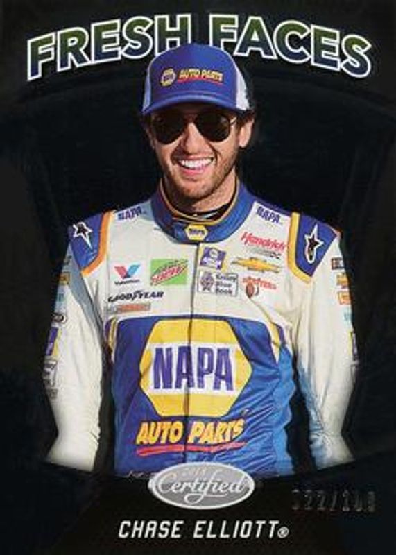 The Chase Elliott 2018 Certified NASCAR #FF1 Fresh Faces /199 card is 1 of 114 Chase Elliott's card variations in the 2018 Certified NASCAR set being tracked by Sports Card Investor, including #29 Base /149, #91 Base /149, #91 Orange /249, #29 Orange /249, and #29 Mirror Gold /25.