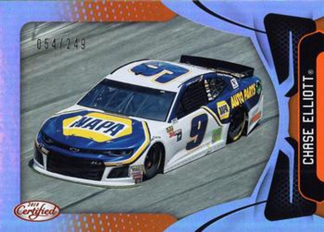 The Chase Elliott 2018 Certified NASCAR #91 Orange /249 card is 1 of 114 Chase Elliott's card variations in the 2018 Certified NASCAR set being tracked by Sports Card Investor, including #29 Base /149, #91 Base /149, #29 Orange /249, #29 Mirror Gold /25, and #91 Mirror Gold /25.