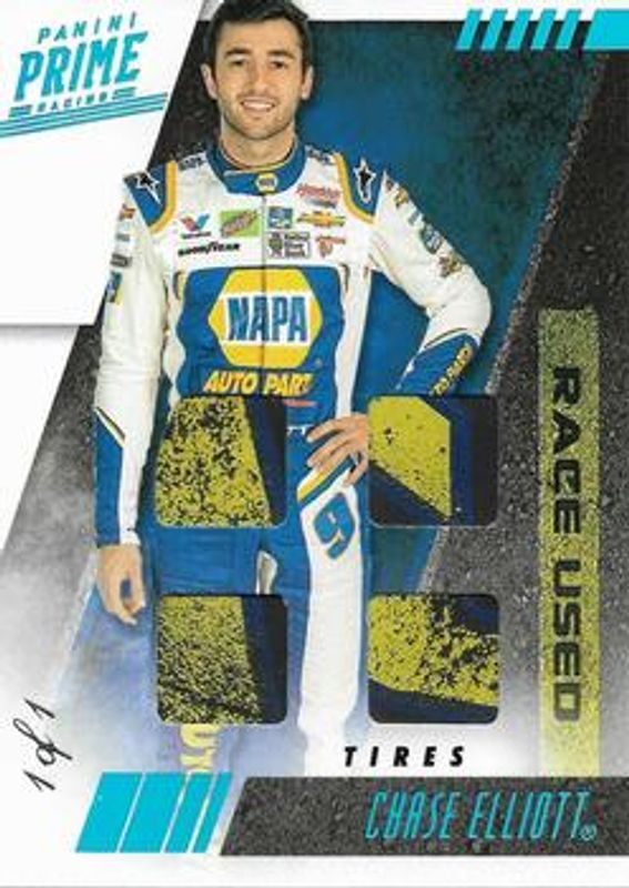 The Chase Elliott 2019 Prime NASCAR #RUQ-CE Race Used Quads Tires - Platinum Blue /1 card is 1 of 132 Chase Elliott's card variations in the 2019 Prime NASCAR set being tracked by Sports Card Investor, including #41 Base /50, #7 Base /50, #74 Base /50, #74 Black /10, and #41 Black /10.