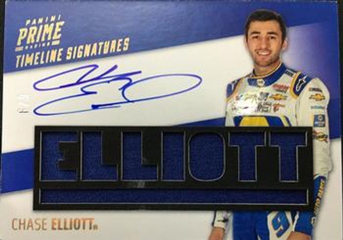The Chase Elliott 2019 Prime NASCAR #TS-CE Timeline Signatures Name /10 card is 1 of 132 Chase Elliott's card variations in the 2019 Prime NASCAR set being tracked by Sports Card Investor, including #41 Base /50, #7 Base /50, #74 Base /50, #74 Black /10, and #41 Black /10.