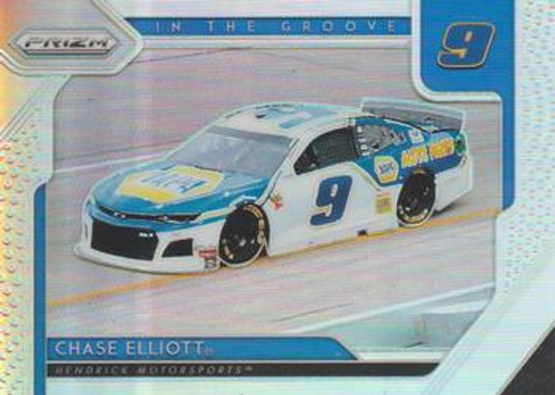 The Chase Elliott 2019 Prizm NASCAR #ITG-3 In the Groove card is 1 of 99 Chase Elliott's card variations in the 2019 Prizm NASCAR set being tracked by Sports Card Investor, including #7a Base, #58 Base, #84 Base, #65 Base, and #71 Base.