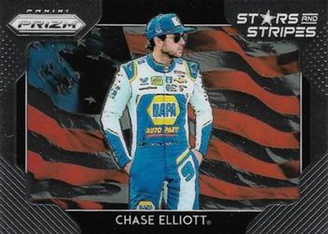 The Chase Elliott 2019 Prizm NASCAR #SS-15 Stars & Stripes card is 1 of 99 Chase Elliott's card variations in the 2019 Prizm NASCAR set being tracked by Sports Card Investor, including #7a Base, #58 Base, #84 Base, #65 Base, and #71 Base.