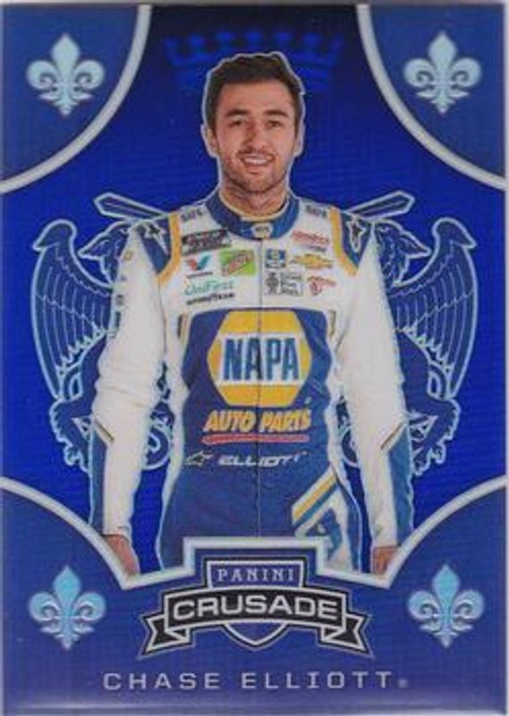 The Chase Elliott 2020 Chronicles NASCAR #23 Crusade Blue /199 card is 1 of 160 Chase Elliott's card variations in the 2020 Chronicles NASCAR set being tracked by Sports Card Investor, including Base, Blue /199, Red /99, Purple /25, and Gold /10.
