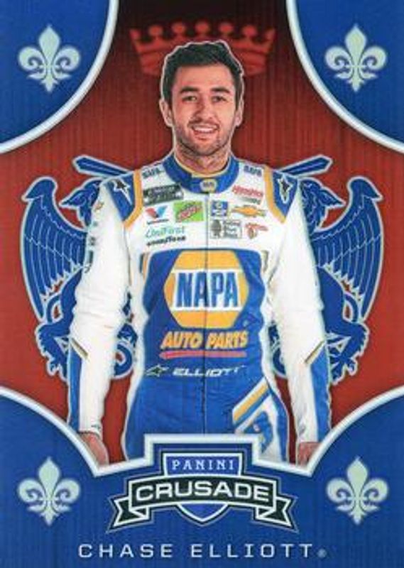 The Chase Elliott 2020 Chronicles NASCAR #23 Crusade Red /99 card is 1 of 160 Chase Elliott's card variations in the 2020 Chronicles NASCAR set being tracked by Sports Card Investor, including Base, Blue /199, Red /99, Purple /25, and Gold /10.