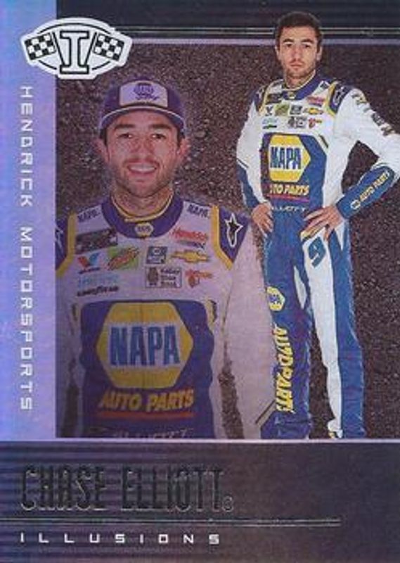 The Chase Elliott 2020 Chronicles NASCAR #10 Illusions card is 1 of 160 Chase Elliott's card variations in the 2020 Chronicles NASCAR set being tracked by Sports Card Investor, including Base, Blue /199, Red /99, Purple /25, and Gold /10.