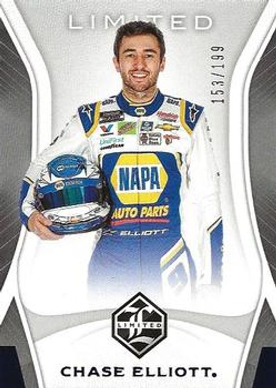 The Chase Elliott 2020 Chronicles NASCAR #3 Limited Blue /199 card is 1 of 160 Chase Elliott's card variations in the 2020 Chronicles NASCAR set being tracked by Sports Card Investor, including Base, Blue /199, Red /99, Purple /25, and Gold /10.