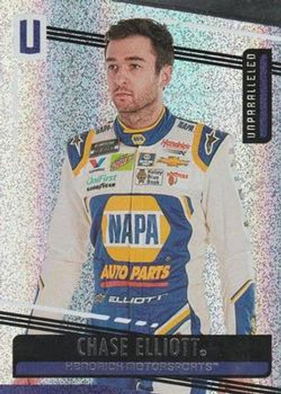 The Chase Elliott 2020 Chronicles NASCAR #9 Unparalleled card is 1 of 160 Chase Elliott's card variations in the 2020 Chronicles NASCAR set being tracked by Sports Card Investor, including Base, Blue /199, Red /99, Purple /25, and Gold /10.