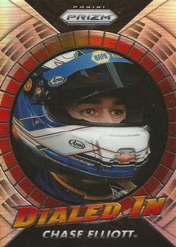 The Chase Elliott 2020 Prizm NASCAR #DI10 Dialed In card is 1 of 82 Chase Elliott's card variations in the 2020 Prizm NASCAR set being tracked by Sports Card Investor, including #7 Base, #85 Base, #7 Blue, #85 Blue, and #7 Blue & Carolina Blue Hyper.