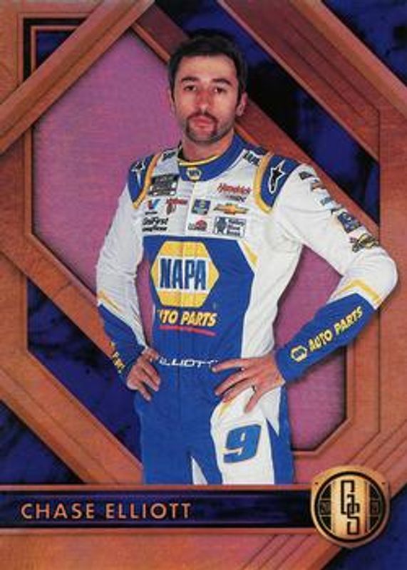 The Chase Elliott 2021 Chronicles NASCAR #9 Gold Standard card is 1 of 166 Chase Elliott's card variations in the 2021 Chronicles NASCAR set being tracked by Sports Card Investor, including Base, Blue /199, Red /99, Purple /25, and Gold /10.