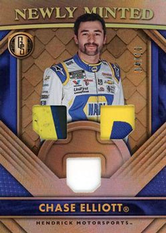 The Chase Elliott 2021 Chronicles NASCAR #GS-CE Gold Standard Newly Minted - Holo Gold /10 card is 1 of 166 Chase Elliott's card variations in the 2021 Chronicles NASCAR set being tracked by Sports Card Investor, including Base, Blue /199, Red /99, Purple /25, and Gold /10.