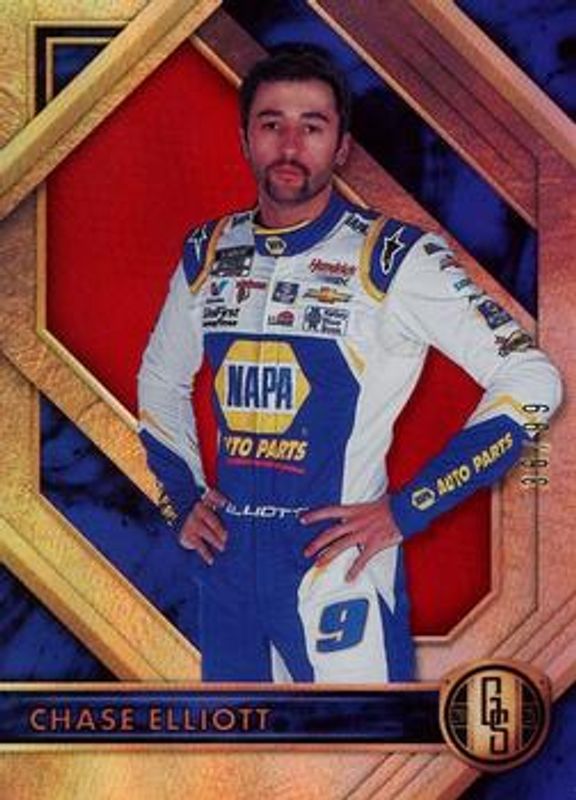 The Chase Elliott 2021 Chronicles NASCAR #9 Gold Standard - Red /99 card is 1 of 166 Chase Elliott's card variations in the 2021 Chronicles NASCAR set being tracked by Sports Card Investor, including Base, Blue /199, Red /99, Purple /25, and Gold /10.