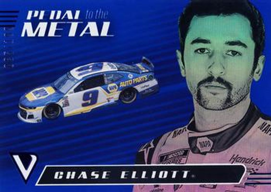 The Chase Elliott 2021 Chronicles NASCAR #1 Pedal to the Metal - Blue /199 card is 1 of 166 Chase Elliott's card variations in the 2021 Chronicles NASCAR set being tracked by Sports Card Investor, including Base, Blue /199, Red /99, Purple /25, and Gold /10.