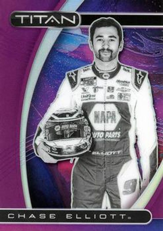 The Chase Elliott 2021 Chronicles NASCAR #1 Titan - Purple /25 card is 1 of 166 Chase Elliott's card variations in the 2021 Chronicles NASCAR set being tracked by Sports Card Investor, including Base, Blue /199, Red /99, Purple /25, and Gold /10.