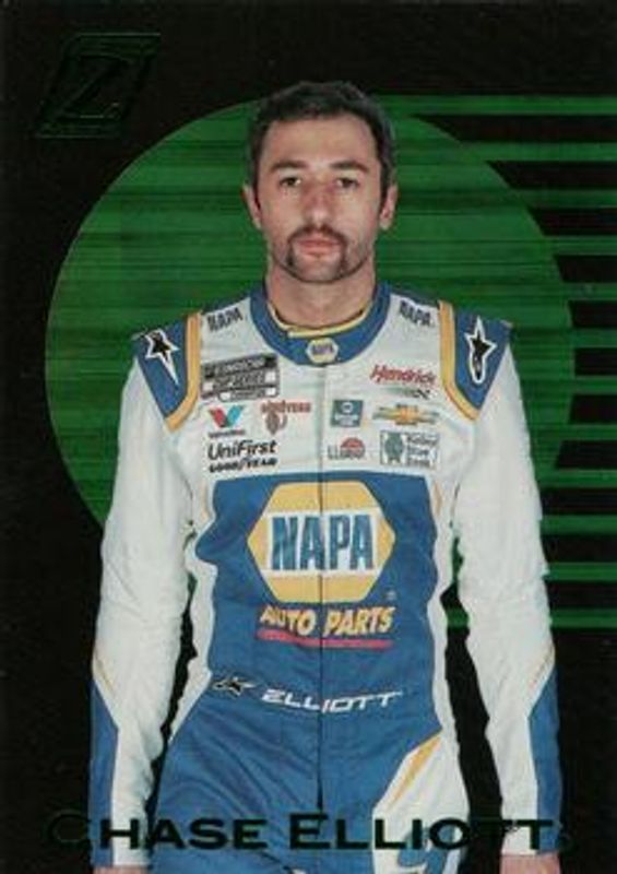 The Chase Elliott 2021 Chronicles NASCAR #16 Zenith - Green card is 1 of 166 Chase Elliott's card variations in the 2021 Chronicles NASCAR set being tracked by Sports Card Investor, including Base, Blue /199, Red /99, Purple /25, and Gold /10.