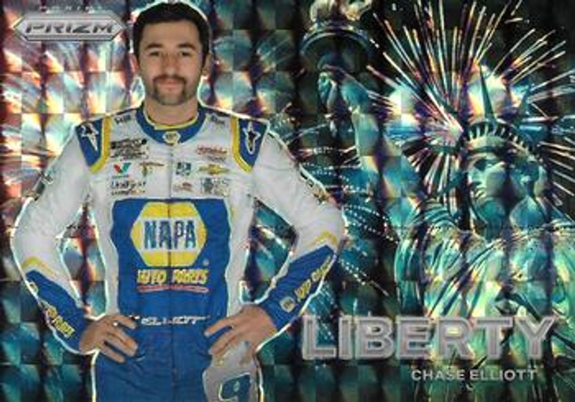 The Chase Elliott 2021 Prizm NASCAR #L14 Liberty card is 1 of 121 Chase Elliott's card variations in the 2021 Prizm NASCAR set being tracked by Sports Card Investor, including #7b Base, #62 Base, #7a Base, #62 Blue, and #7b Blue.