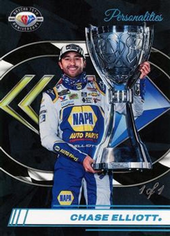 Chase Elliott 2023 Donruss NASCAR #18 NASCAR 75th Anniversary - Holo Platinum Blue /1 RAW Price Guide