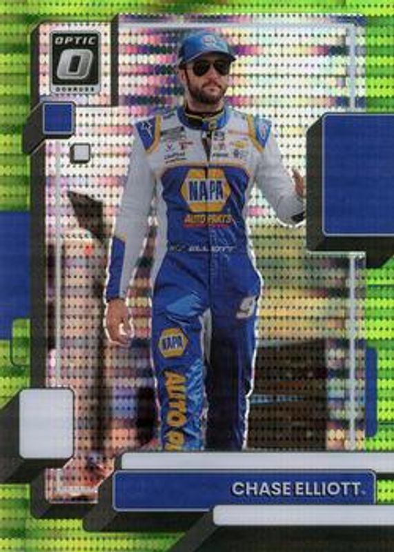 The Chase Elliott 2023 Donruss NASCAR #24 Optic Lime Green Pulsar card is 1 of 167 Chase Elliott's card variations in the 2023 Donruss NASCAR set being tracked by Sports Card Investor, including #43 Base, #9 Base, #120 Base, #127 Base, and #120 Carolina Blue.