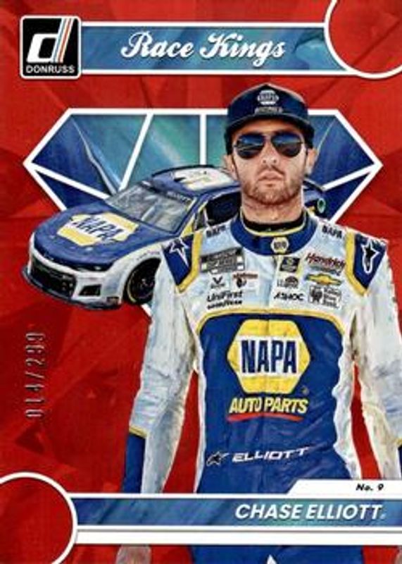 The Chase Elliott 2023 Donruss NASCAR #9 Red /299 card is 1 of 167 Chase Elliott's card variations in the 2023 Donruss NASCAR set being tracked by Sports Card Investor, including #43 Base, #9 Base, #120 Base, #127 Base, and #120 Carolina Blue.