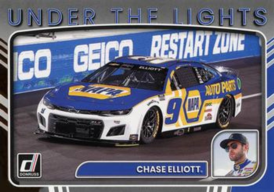 The Chase Elliott 2023 Donruss NASCAR #UL6 Under The Lights Retail card is 1 of 167 Chase Elliott's card variations in the 2023 Donruss NASCAR set being tracked by Sports Card Investor, including #43 Base, #9 Base, #120 Base, #127 Base, and #120 Carolina Blue.