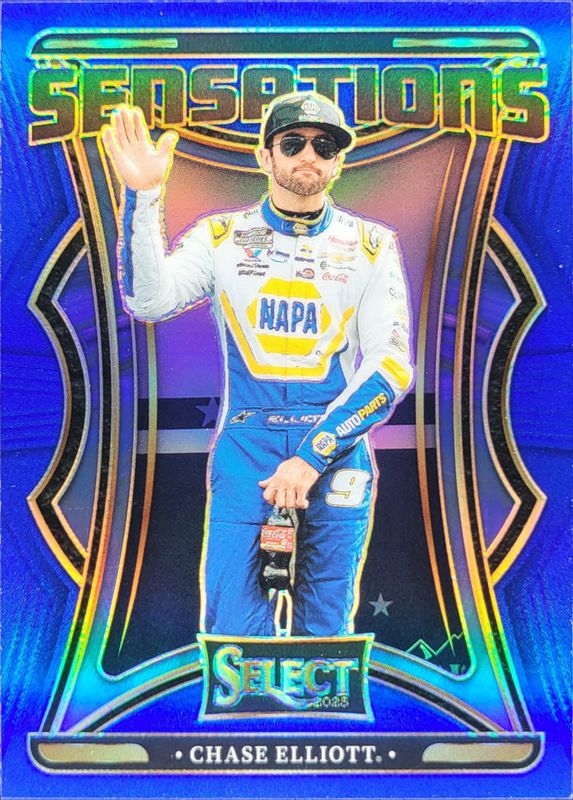 The Chase Elliott 2025 Select NASCAR #7 Sensations Blue /49 card is 1 of 138 Chase Elliott's card variations in the 2025 Select NASCAR set being tracked by Sports Card Investor, including Artistic Selections, Autographed Memorabilia Flash, Base Pit Road, Base Pit Road Orange Flash, and Base Pit Road Orange Ice.
