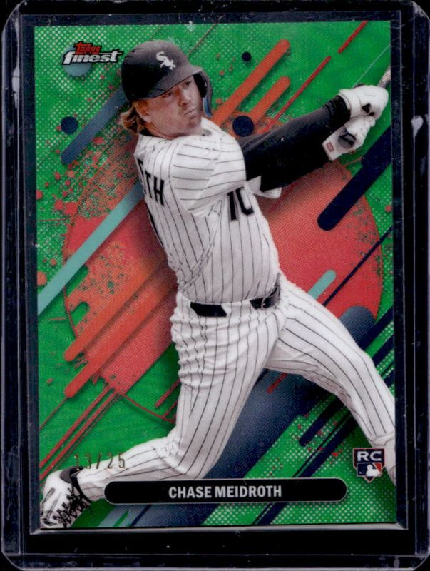 The Chase Meidroth 2025 Topps Finest #220 Base Rare - Green Refractor /25 Rookie card is 1 of 17 Chase Meidroth's card variations in the 2025 Topps Finest set being tracked by Sports Card Investor, including Base Rare, Base Rare - Oil Spill Refractor, Base Rare - Refractor, Base Rare - X-Fractor, and Base Rare - Magenta /200.