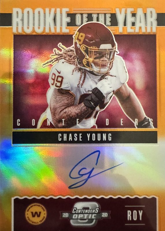 The Chase Young 2020 Contenders Optic #ROY8 Rookie of the Year Contenders Autographs - Orange /50 card in Raw condition has not changed in price in the last 30 days and was last sold for $50.00 .