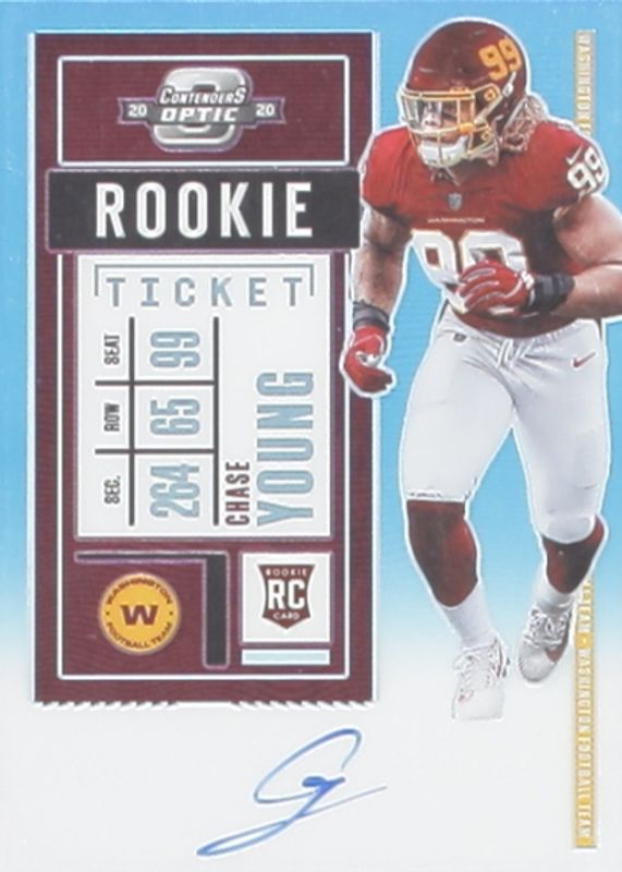 This card is 1 of 19 Chase Young's card variations in the 2020 Contenders Optic set being tracked by Sports Card Investor, including Rookie Ticket Auto, Rookie Ticket Auto - Silver, Rookie Ticket Auto - Red /199, Rookie of the Year Contenders Autographs /99, and Rookie of the Year Contenders Autographs - Blue /75.