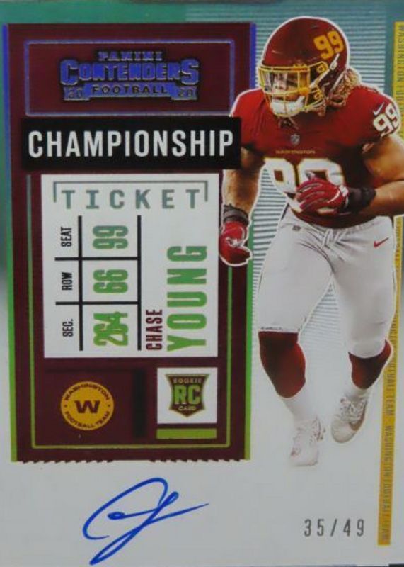 The Chase Young 2020 Contenders #102 Rookie Ticket Auto - Championship Ticket /49 card in Raw condition has not changed in price in the last 30 days and was last sold for $9.99 .