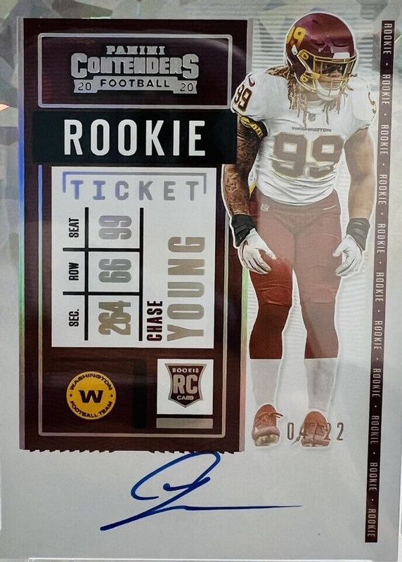 This card is 1 of 21 Chase Young's card variations in the 2020 Contenders set being tracked by Sports Card Investor, including Rookie Ticket Auto, Rookie Ticket Auto Variation, Rookie Ticket Auto - Red Zone Ticket, Rookie Ticket Auto - Ticket Stub (/99), and Rookie Ticket Auto Variation - Red Zone Ticket.