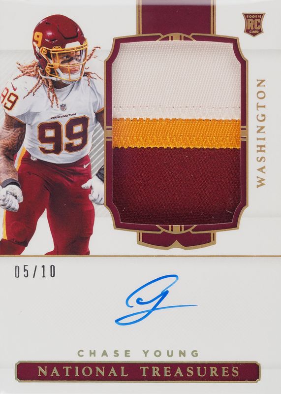 This card is 1 of 49 Chase Young's card variations in the 2020 National Treasures set being tracked by Sports Card Investor, including Rookie Patch Auto /99, Rookie Patch Auto - Green Jersey Number (/99), Rookie Patch Auto - Holo Silver /25, Rookie Patch Auto - Midnight /20, and Rookie Patch Auto - Stars & Stripes /20.