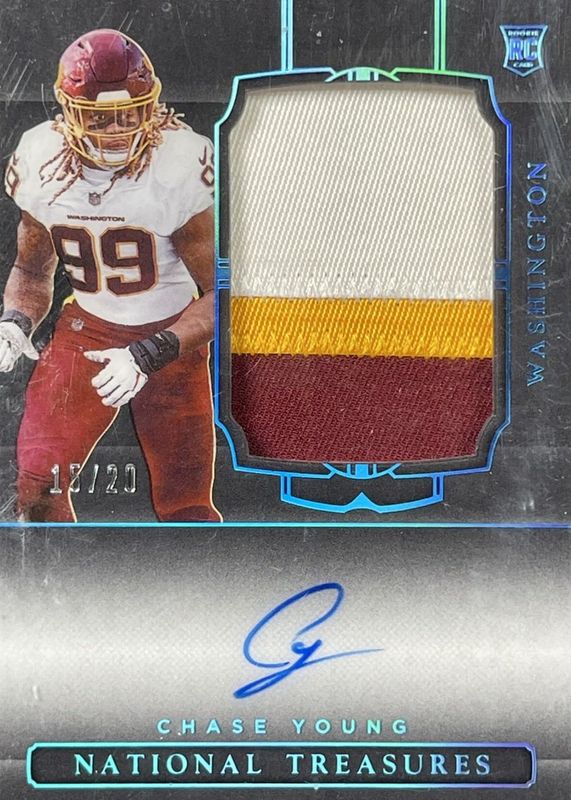 This card is 1 of 49 Chase Young's card variations in the 2020 National Treasures set being tracked by Sports Card Investor, including Rookie Patch Auto /99, Rookie Patch Auto - Green Jersey Number (/99), Rookie Patch Auto - Holo Silver /25, Rookie Patch Auto - Stars & Stripes /20, and Rookie Patch Auto - Holo Gold /10.