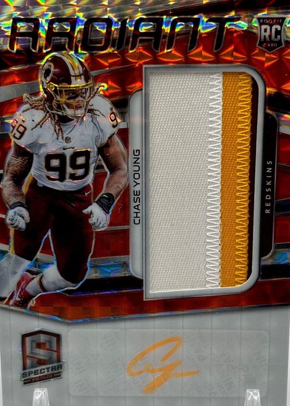 The Chase Young 2020 Spectra #8 Radiant Rookie Patch Signatures - Neon Orange (/15) card in Raw condition has not changed in price in the last 30 days and was last sold for $26.00 .