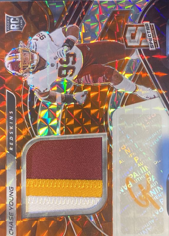 The Chase Young 2020 Spectra #215 Rookie Patch Auto - Neon Orange /15 card in Raw condition has not changed in price in the last 30 days and was last sold for $59.00 .