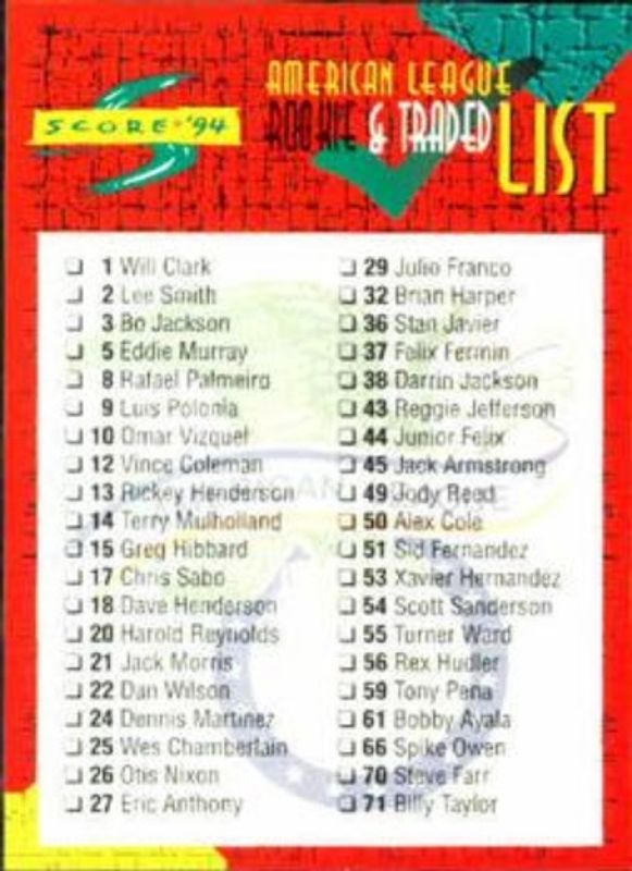 Other popular players in the 1994 Score Rookie & Traded set include Will Clark, Ellis Burks, Bo Jackson, Rafael Palmeiro, and Brian Hunter.