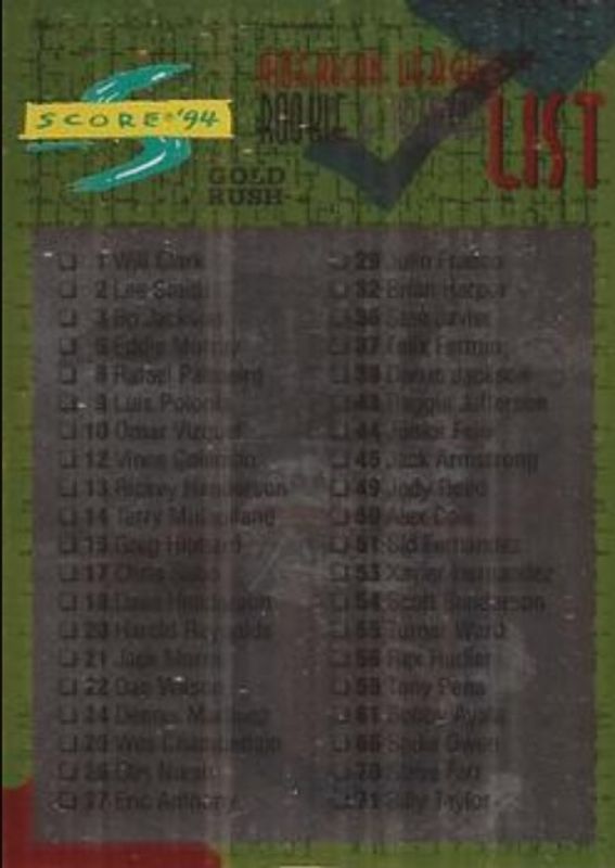 Other popular players in the 1994 Score Rookie & Traded set include Will Clark, Ellis Burks, Bo Jackson, Rafael Palmeiro, and Brian Hunter.