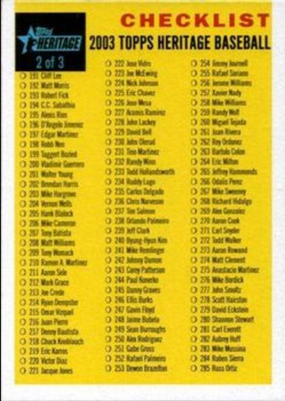 The Checklist 2003 Topps Heritage #2 Checklists card is 1 of 3 Checklist's card variations in the 2003 Topps Heritage set being tracked by Sports Card Investor, including #1 Checklists, and #3 Checklists.