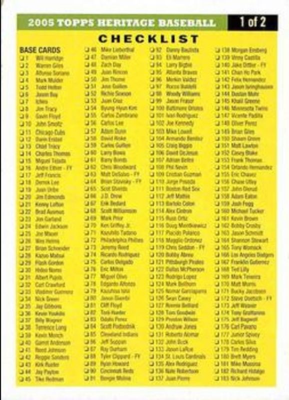 The Checklist 2005 Topps Heritage #1 Checklists card is 1 of 2 Checklist's card variations in the 2005 Topps Heritage set being tracked by Sports Card Investor, including Checklists.
