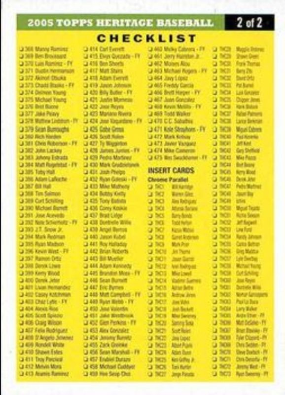 The Checklist 2005 Topps Heritage #2 Checklists card is 1 of 2 Checklist's card variations in the 2005 Topps Heritage set being tracked by Sports Card Investor, including Checklists.