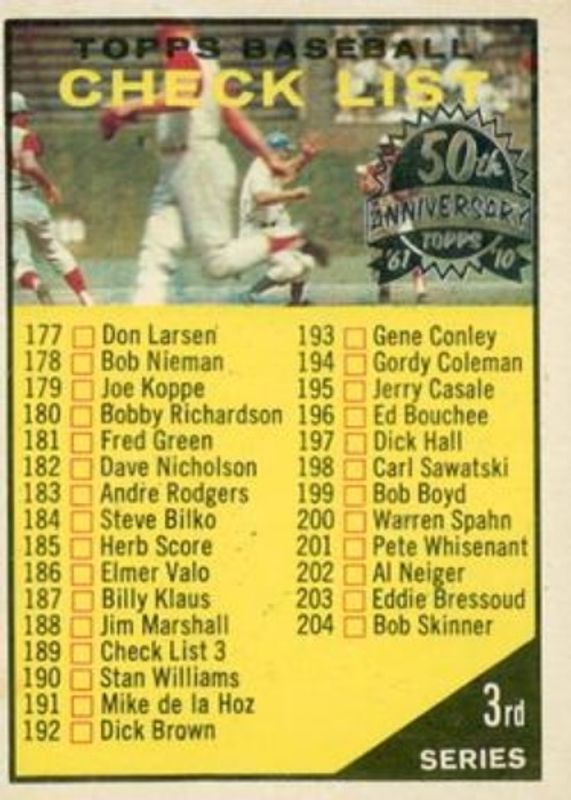The Checklist 2010 Topps Heritage #189 50th Anniversary Buybacks card is 1 of 12 Checklist's card variations in the 2010 Topps Heritage set being tracked by Sports Card Investor, including #17 Base, #189 Base, #273 Base, #361 Base, and #423 Base.