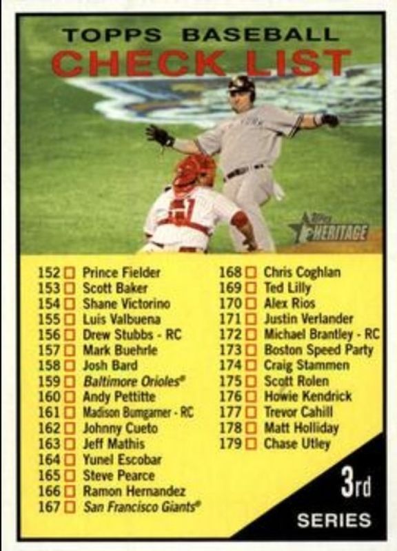 The Checklist 2010 Topps Heritage #189 Base card is 1 of 12 Checklist's card variations in the 2010 Topps Heritage set being tracked by Sports Card Investor, including #17 Base, #273 Base, #361 Base, #423 Base, and #437 Base.