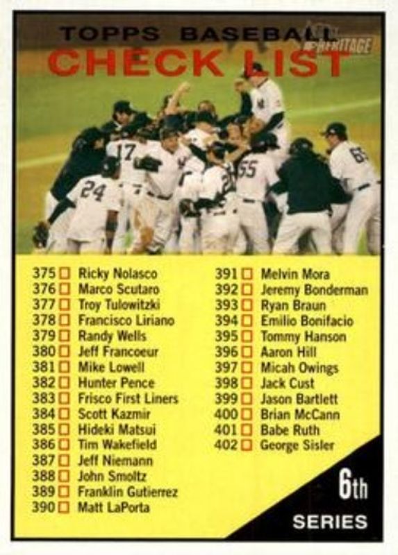 The Checklist 2010 Topps Heritage #423 Base card is 1 of 12 Checklist's card variations in the 2010 Topps Heritage set being tracked by Sports Card Investor, including #17 Base, #189 Base, #273 Base, #361 Base, and #437 Base.
