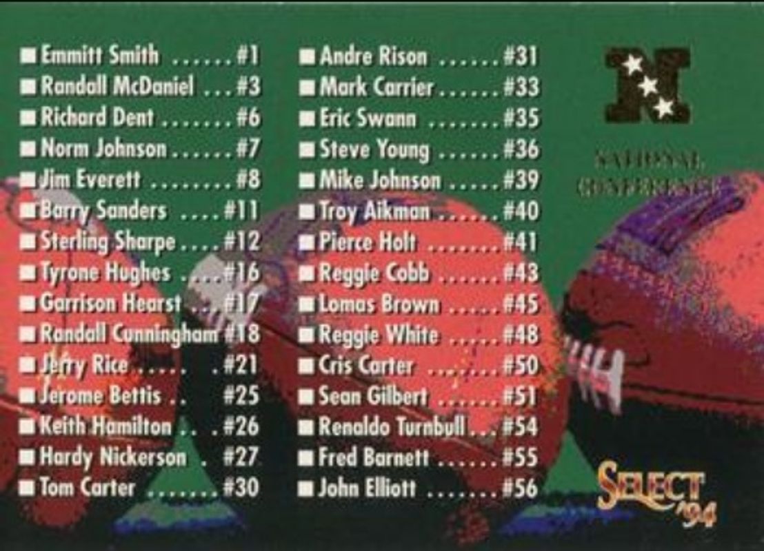 Other popular players in the 1994 Pinnacle Select set include Barry Sanders, Drew Bledsoe, Jerome Bettis, Mark Carrier, and Bruce Smith.
