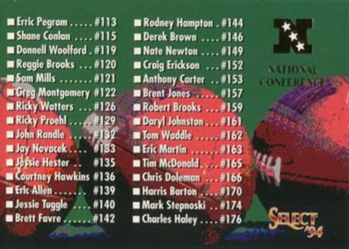 Other popular players in the 1994 Pinnacle Select set include Barry Sanders, Drew Bledsoe, Jerome Bettis, Mark Carrier, and Bruce Smith.